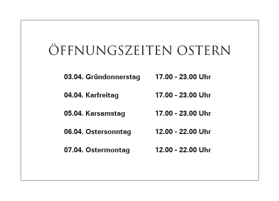 Sonntag und Feiertag 12.00 - 22.00 Uhr (Küche 12.00 – 15.00 Uhr und 16.00 - 20.00 Uhr)